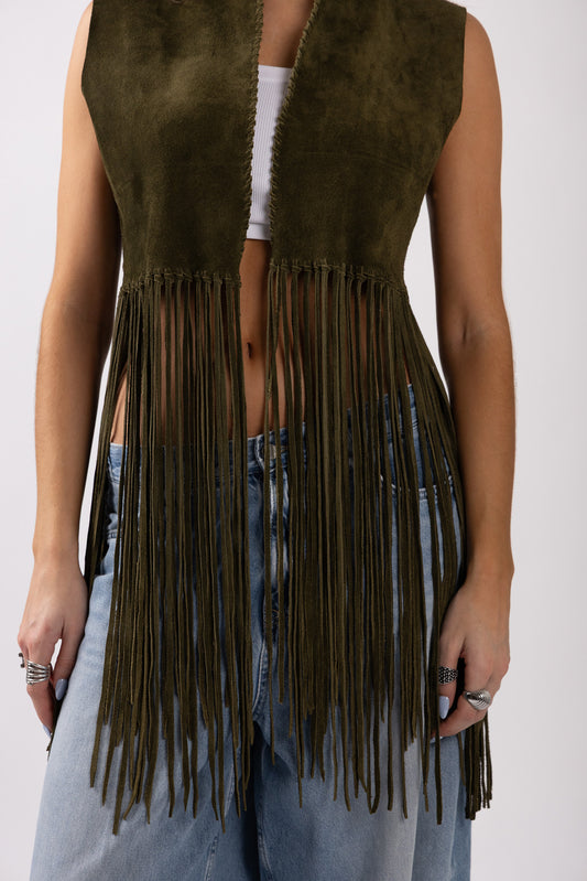 Crafted from green suede leather, its natural texture brings depth and character, while hand-tied leather fringe drapes fluidly from the hem — creating movement with every step. The cropped silhouette feels both bold and intentional.