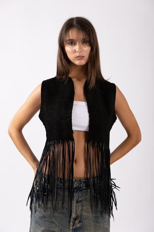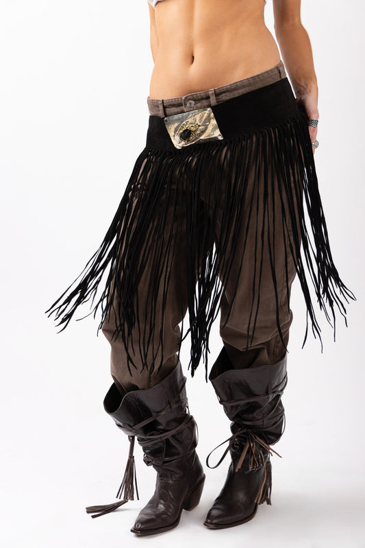 Crafted from black suede leather, its natural texture brings depth and character, while hand-tied leather fringe drapes fluidly from the hem — creating movement with every step. The cropped silhouette feels both bold and intentional.