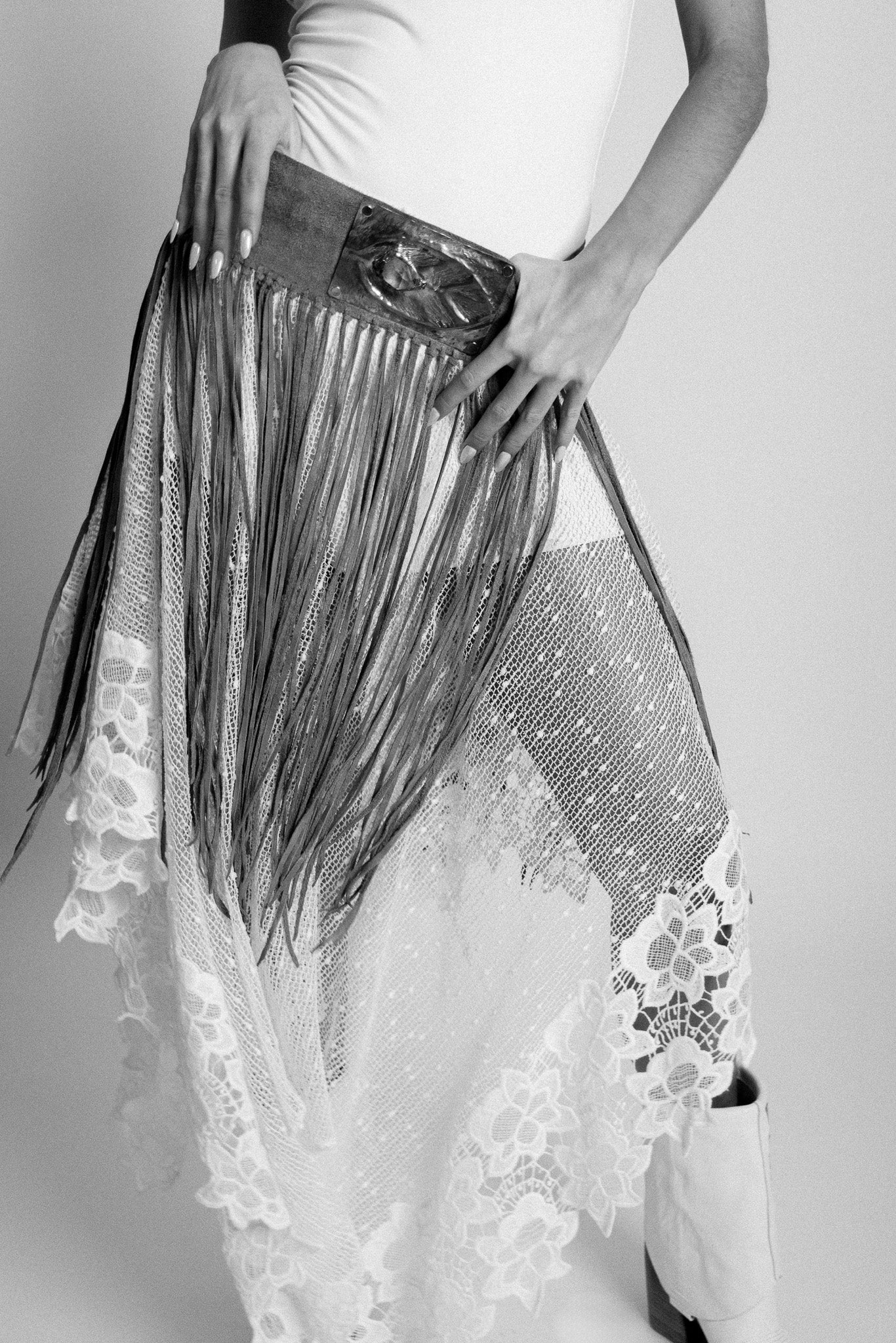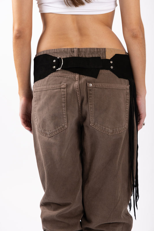 Crafted from genuine black suede leather, its deep tone creates a strong, sculptural presence. Full-length fringe falls from the waist with deliberate movement, while the adjustable back straps allow you to shape the fit with intention.