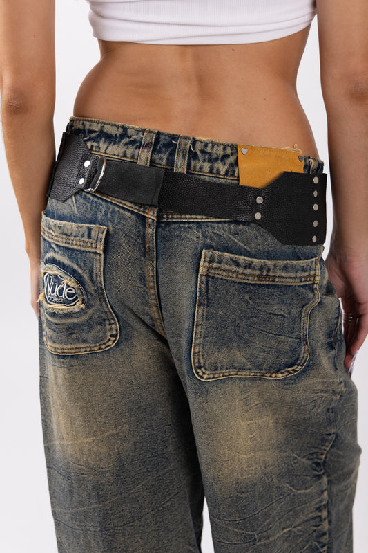 Crafted from black suede leather, its deep tone creates a bold, sculptural base. Designed to sit low and defined at the waist, it features a single-sided cascade of hand-cut fringe — creating asymmetrical movement with intention. Adjustable back straps allow for a personalized, secure fit.