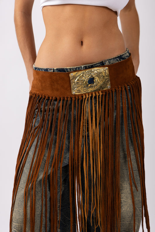 Crafted from brown suede leather, its warm tone reflects the spirit of Argentina’s countryside. Full-length hand-cut fringe drapes from the waist with fluid movement, creating rhythm and presence with every step. Designed to sit low and defined, adjustable back straps allow you to shape the fit as you choose.