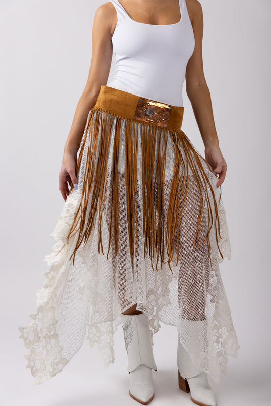 Crafted from green suede leather, its natural texture brings depth and richness, while full-length hand-cut fringe drapes fluidly from the waist — creating movement with every step. Designed to sit low and bold, it wraps the body with intention and adjusts at the back for a customizable fit.