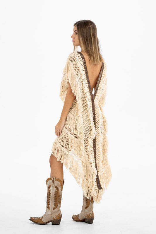 Regular price $500.00Regular priceUnit price / perAiming to capture the free-spirited essence of native tribes, the Spirit Midi Dress was born. Expertly crafted from cotton threads and featuring a handmade pattern of natural fringes, this dress blends native techniques with modern designs. The leather V-line neck runs across the back of the dress, revealing a beautiful backless silhouette.