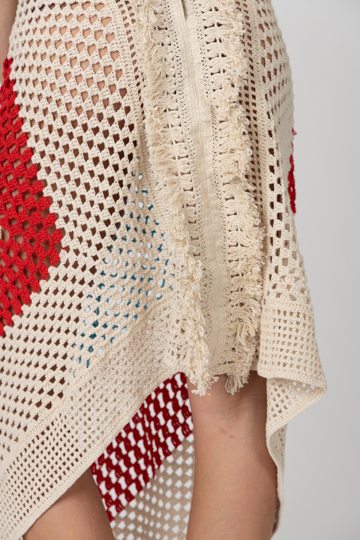 Natural crochet brought to life with vivid red and blue panels. Designed with a halter neck, fringe trims, and an open back, the Hibiscus Dress captures movement and ease. Its asymmetric silhouette gives it a raw, bohemian spirit—made to wander and stand out.