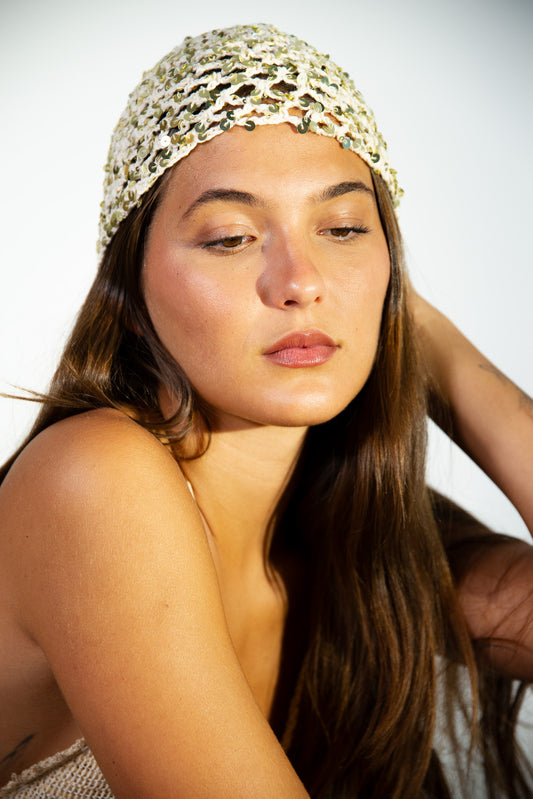 Regular price $60.00Regular priceUnit price / perSale price $60.00A statement crochet hat woven with golden sequin details. Lightweight yet striking, it reflects light beautifully, adding texture and shine to your bohemian wardrobe.