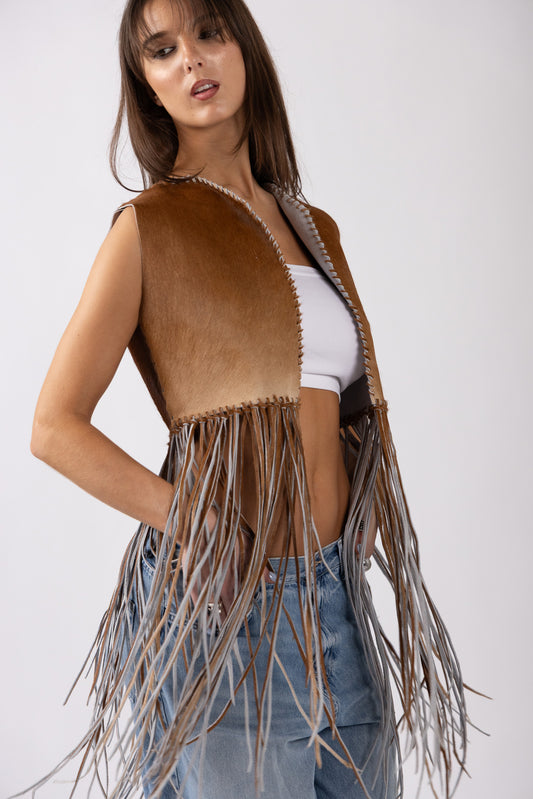 Crafted from genuine brown cowhide leather, its natural fur texture brings depth and character, while hand-tied leather fringe drapes fluidly from the hem — creating movement with every step. The cropped silhouette feels both bold and intentional.
