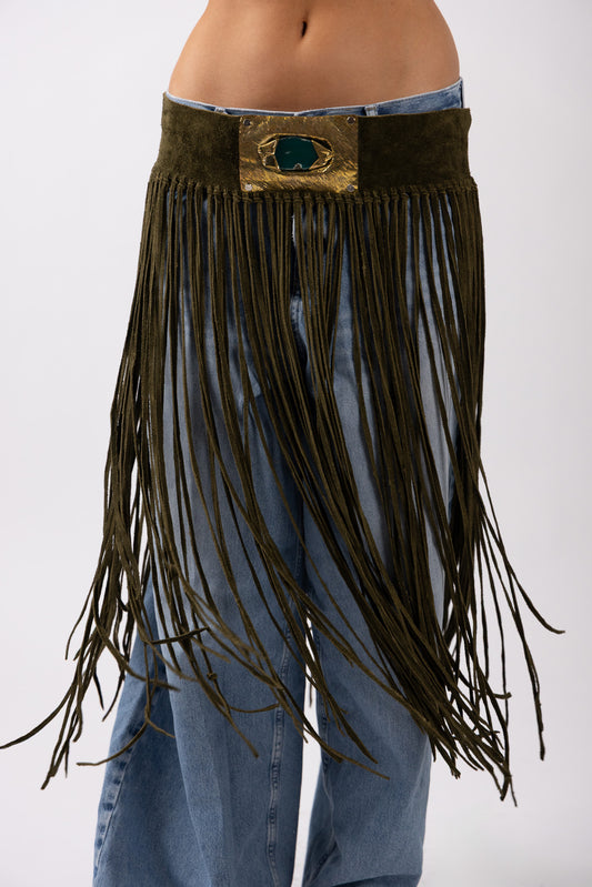 Crafted from green suede leather, its natural texture brings depth and richness, while full-length hand-cut fringe drapes fluidly from the waist — creating movement with every step. Designed to sit low and bold, it wraps the body with intention and adjusts at the back for a customizable fit.