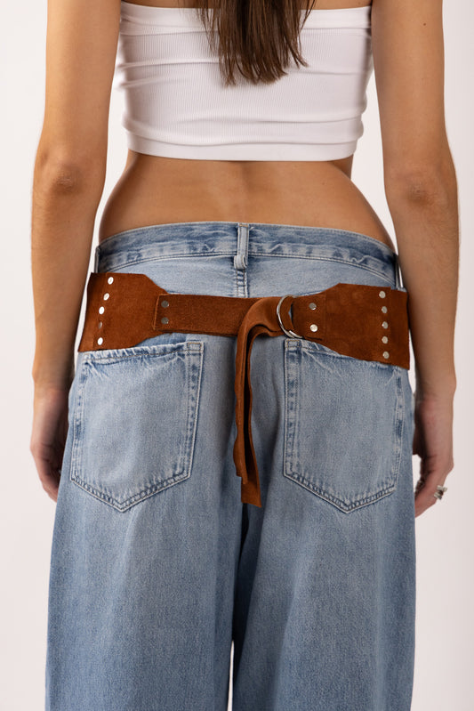 Crafted from brown suede leather, its structure is clean and intentional. The wide silhouette embraces the waist, while adjustable back straps allow you to shape the fit as you choose.