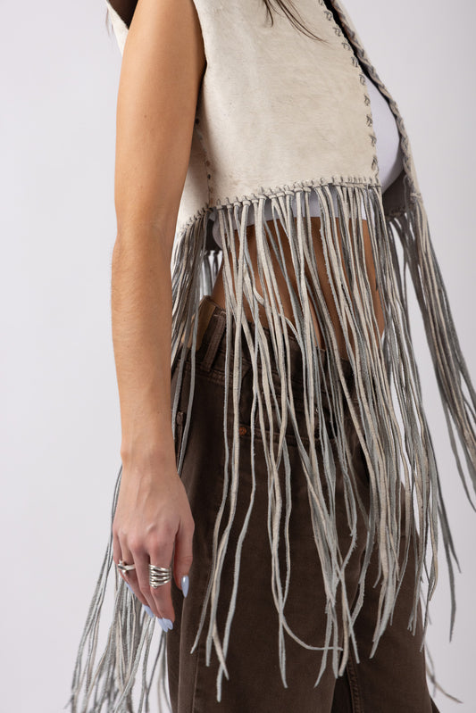 Crafted from genuine black suede leather, its deep tone creates a strong, sculptural presence. Full-length fringe falls from the waist with deliberate movement, while the adjustable back straps allow you to shape the fit with intention.