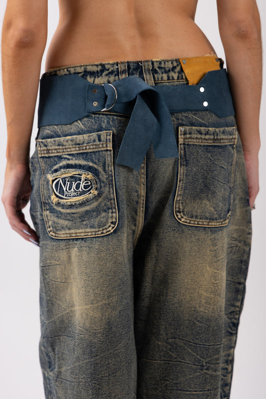 Crafted from blue suede leather, its structure is clean and intentional. The wide silhouette anchors the waist, while adjustable back straps allow you to shape the fit as you choose.