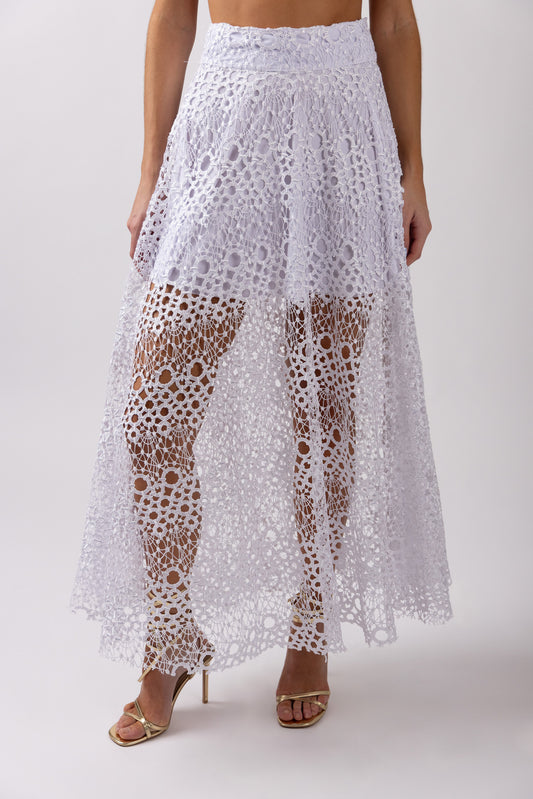 Crafted from intricate guipure lace, the silhouette feels both structured and fluid. A tailored waistband defines the waist with precision, while the skirt falls into a soft, elongated shape that moves naturally with the body. A lined inner mini skirt offers subtle coverage, allowing the legs to reveal themselves conservatively through the lace.
