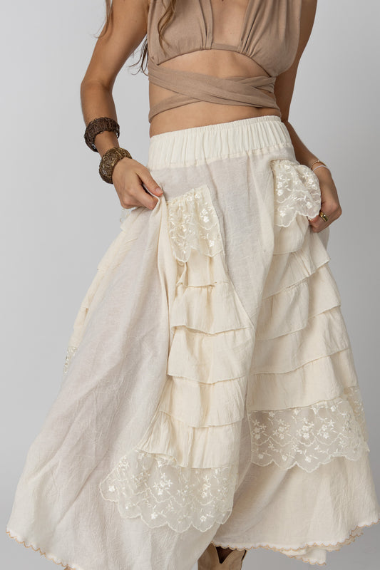 Regular price $ 5,270.00Regular priceUnit price / perSale price $ 5,270.00Romantic and earthy, the Bohemia Ruffled Skirt is a story told in texture and movement. Crafted from delicate cotton gauze and finished with charming lace details on the cascading ruffles, this skirt blends design and comfort. Its elastic waistband ensures ease and flow.
