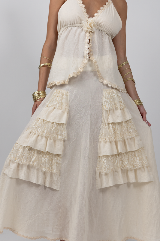 With its elastic waist and delicate construction, it carries the ease of everyday wear while holding the artistry of handcrafted detail. Feminine, versatile, and made to be layered, styled, and lived in.