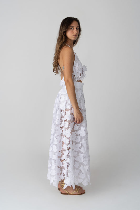 Designed to pair seamlessly with the Narciso Halter Top, this piece captures the poetry of lace and the beauty of femininity. -