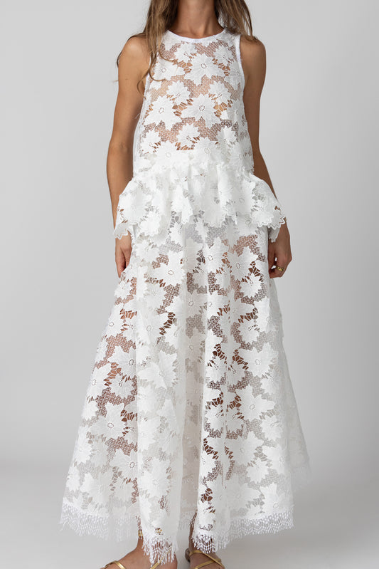 Regular price $ 5,647.00Regular priceUnit price / perSale price $ 5,647.00Born from the soul of lace, the Narciso Maxi Skirt is a timeless piece that speaks of elegance and freedom. Crafted from delicate white lace, it features a tailored waist and an A-line silhouette that flows with ease. The raw, untrimmed hems preserve the integrity of each floral motif, allowing the lace to tell its own story without interruption. Effortlessly romantic, it embodies the essence of refinement and natural grace.