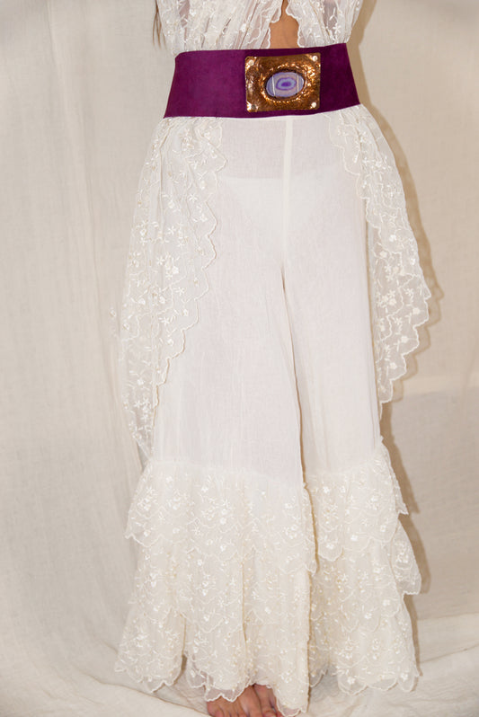 Regular price $ 5,270.00Regular priceUnit price / perSale price $ 5,270.00A flow of lace and freedom, the Paros Pant is crafted from airy white cotton lace with a delicate floral pattern. Its elastic waist offers ease, while the ruffled hem adds a playful bohemian finish. Breezy, bold, and undeniably soulful, this piece moves with you—from sunlit days to moonlit nights.