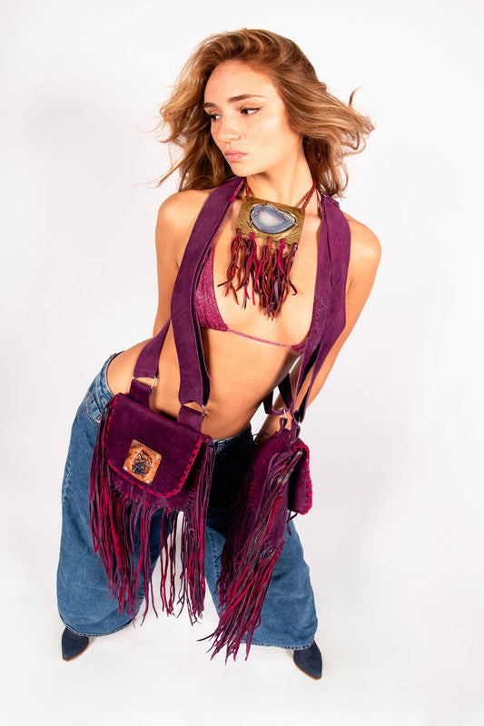 Regular price $ 7,160.00Regular priceUnit price / perSale price $ 7,160.00Artisanal Fanny Pack Vest made in Argentina. The piece is composed of a vibrant Violet - Fuchsia Leather (gamuza), with hand tied fringes.
