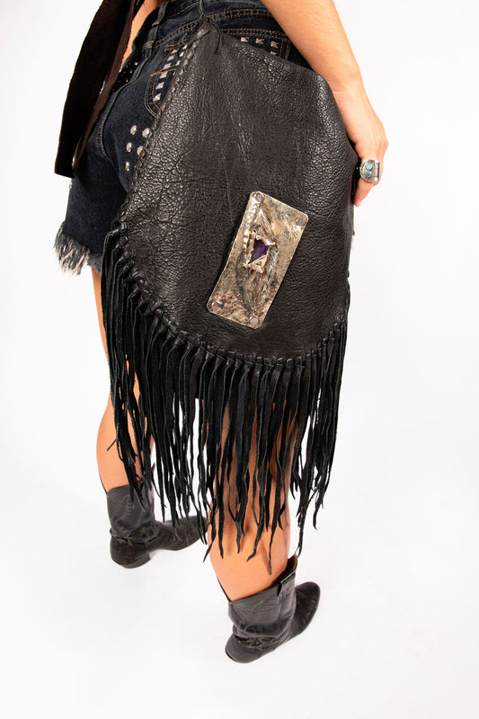 Regular price $ 4,711.00Regular priceUnit price / perSale price $ 4,711.00Artisanal bag made in Argentina. The piece is composed of a real black leather with fringes, an Alpaca silver plate with a Violet Agate Gemstone.