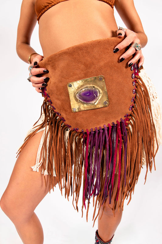 Regular price $ 5,276.00Regular priceUnit price / perSale price $ 5,276.00Artisanal Fanny Pack made in Argentina. The piece is composed of a vibrant Brown Leather (gamuza), with colorful hand-tied fringes. The Brass Plate is decorated with a Violet Agate Gemstone.