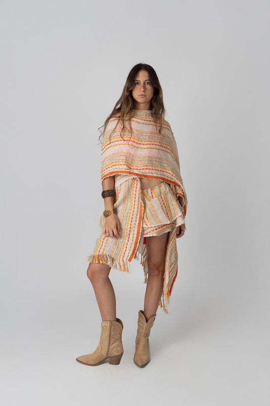 Regular price $ 2,991.00Regular priceUnit price / perSale price $ 2,991.00Born from what remains, the Sunset Mini Skirt is crafted from rustic cotton gauze, repurposed from our signature kimonos. Its layered ruffles capture movement and light, while tie-at-the-waist straps create an adjustable, effortless fit. Designed as one size and produced in small batches, each piece is unique—woven with the spirit of reinvention and the colors of a lasting sunset.