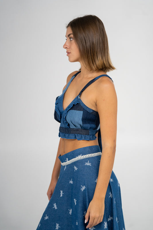 Designed to pair seamlessly with the Patchwork Mini Skirt, this piece captures the poetry of upcycling and beauty of rebirth. -