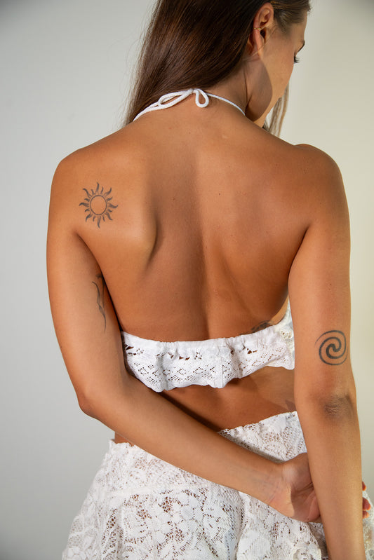 Regular price $ 2,243.00Regular priceUnit price / perSale price $ 2,243.00The Lila Petite Top is a halter-style crop made from leftover cotton fabric, finished with soft ruffle accents and vintage hem details. Its adjustable tie at the neck offers a customizable fit, making it effortless to style on its own or as the perfect match to the Lila Mini Skirt. Produced in small batches, every piece is a reflection of sustainable design and thoughtful craft.
